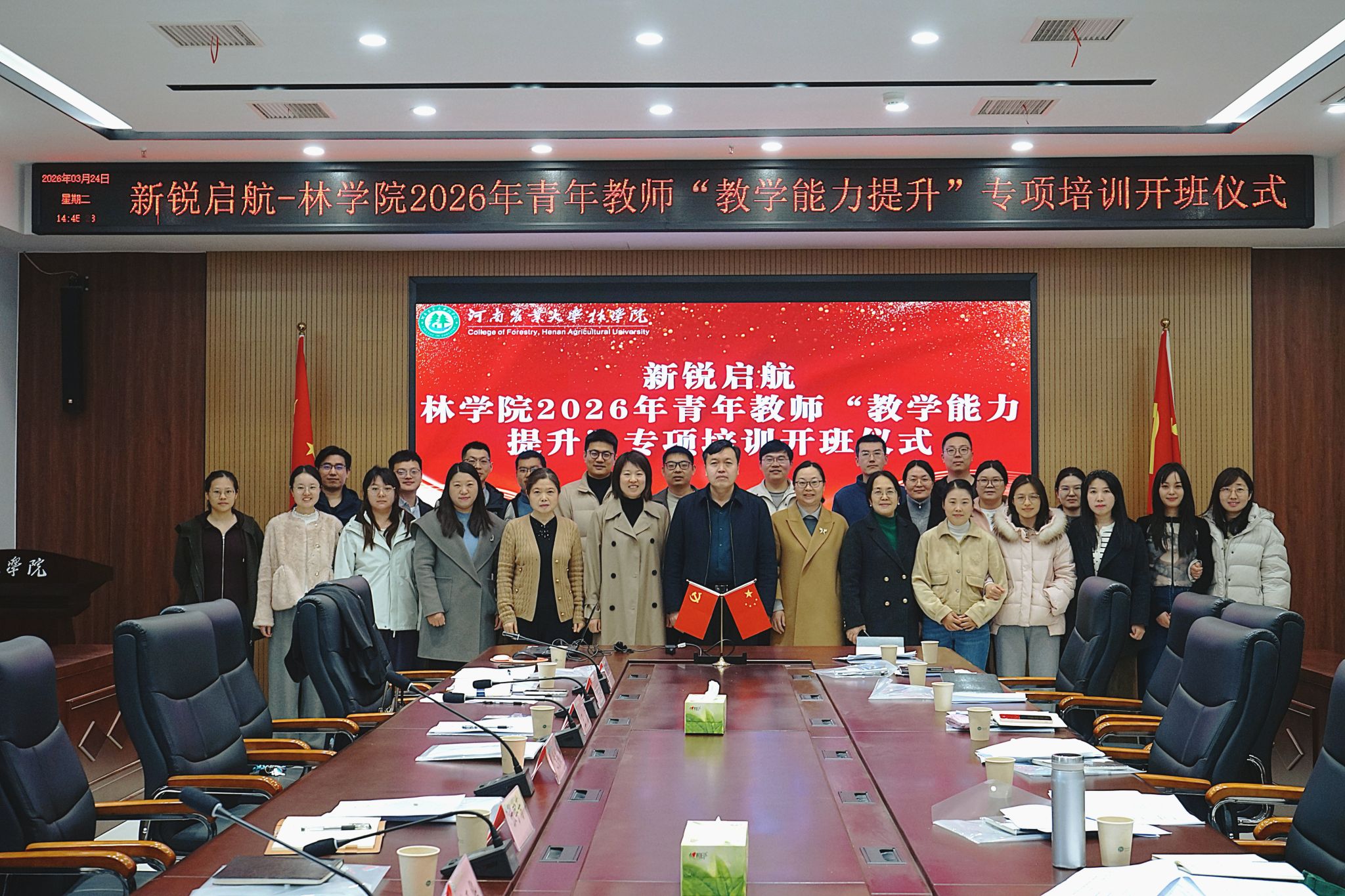 在龙子湖校区举行“新锐启航——2026年青年教师教学能力提升专项培训月”开班仪式暨首场专题讲座。学院党委书记化青报出席并致辞,副院长李喜梅主持活动,教学督导朱秀红教授作首场专题报告。全体近三年新入职专任教师参加活动。