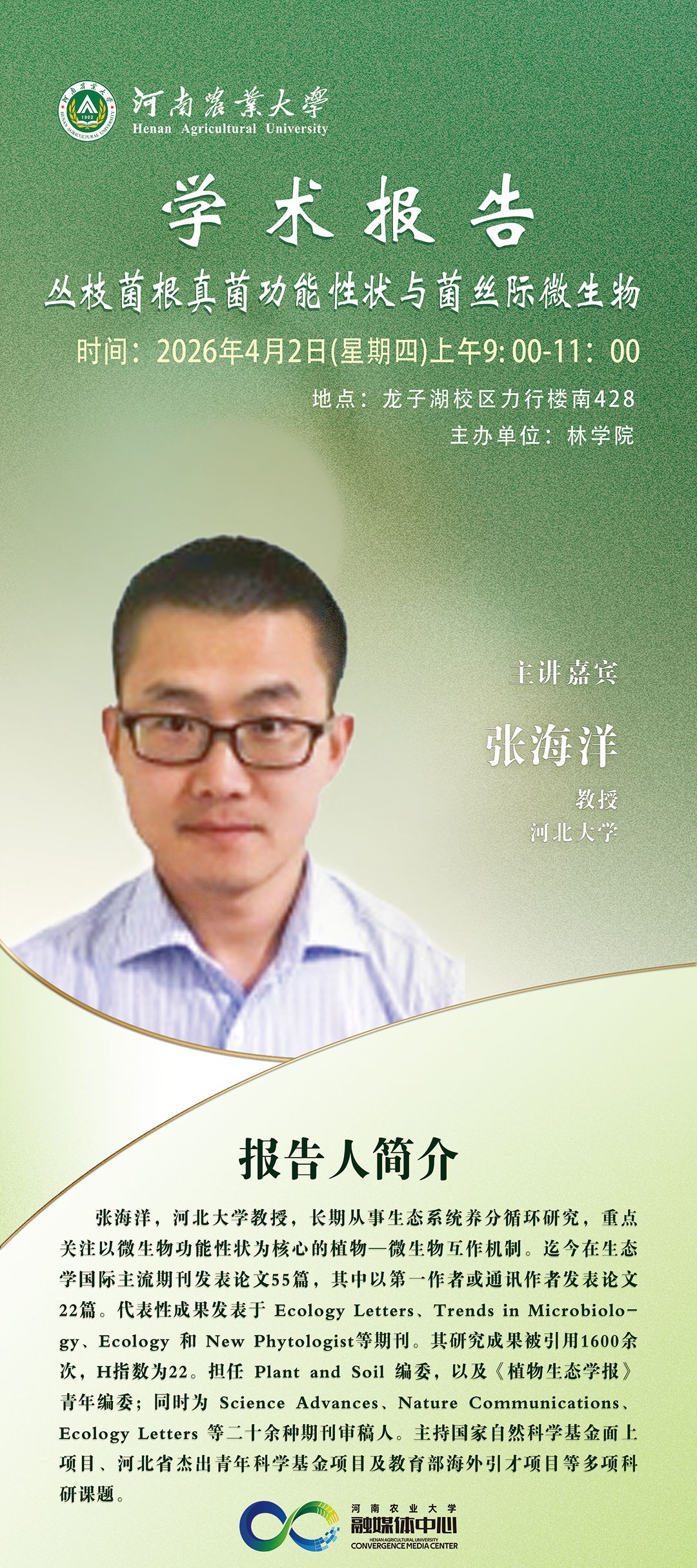 报告人简介张海洋,河北大学教授,长期从事生态系统养分循环研究,重点关注以微生物功能性状为核心的植物微生物互作机制。迄今在生态学国际主流期刊发表论文55篇,其中以第一作者或通讯作者发表论文22篇。代表性成果发表于 Ecology LettersTrends in MicrobiologyEcology New Phytologist等期刊。其研究成果被引用1600余次,H指数为22。担任 Plant and Soil 编委,以及《植物生态学报》青年编委;同时为 Science AdvancesNature CommunicationsEcology Letters 等二十余种期刊审稿人。主持国家自然科学基金面上项目、河北省杰出青年科学基金项目及教育部海外引才项目等多项科研课题。