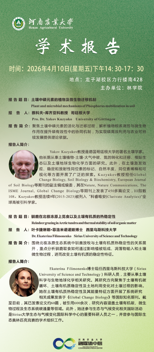 报告人简介Yakov Kuzyakov教授是德国哥廷根大学的著名土壤学家。他长期从事土壤植物-土壤-大气中碳、氮的转化和迁移、根际生态以及土壤地球生物化学方面的研究。此外,在土壤激发效应、稳定和放射性同位素的标记、自然丰度、同位素稀释和可视化等方面开展了广泛的探索。Kuzyakov教授担任Global Change Biology, Soil Biology & Biochemistry, European Journal of Soil Biology等期刊的副主编或编委,其在Nature, Nature Communications, The ISME Journal, Global Change Biology等期刊上发表了450多篇论文,HI指数108Kuzyakov教授连续9(2015-2023)被列入“科睿唯安(Clarivate Analytics)”全球高被引科学家。